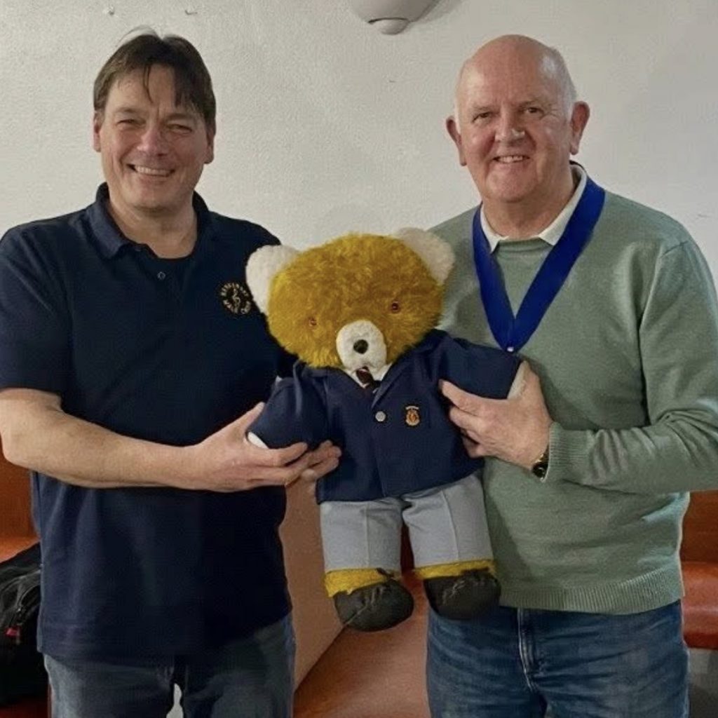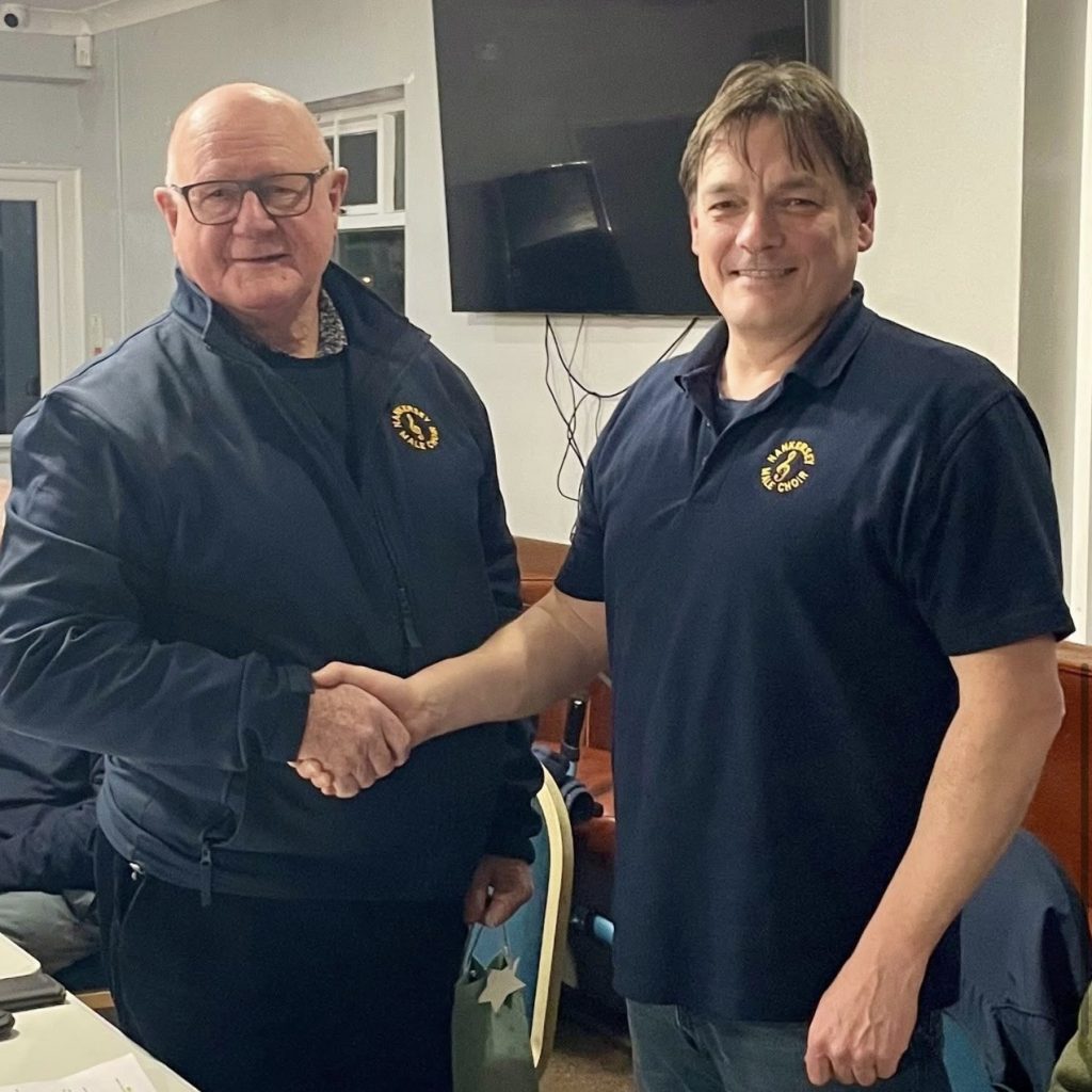 The AGM was held this evening at Penryn Athletic Football Club. Following the formal business proceedings, David Lansdowne, who has done a wonderful job over the past two years, formally handed over the President’s regalia – including the Choir mascot, of course – to our newly elected President, Dave Foster.