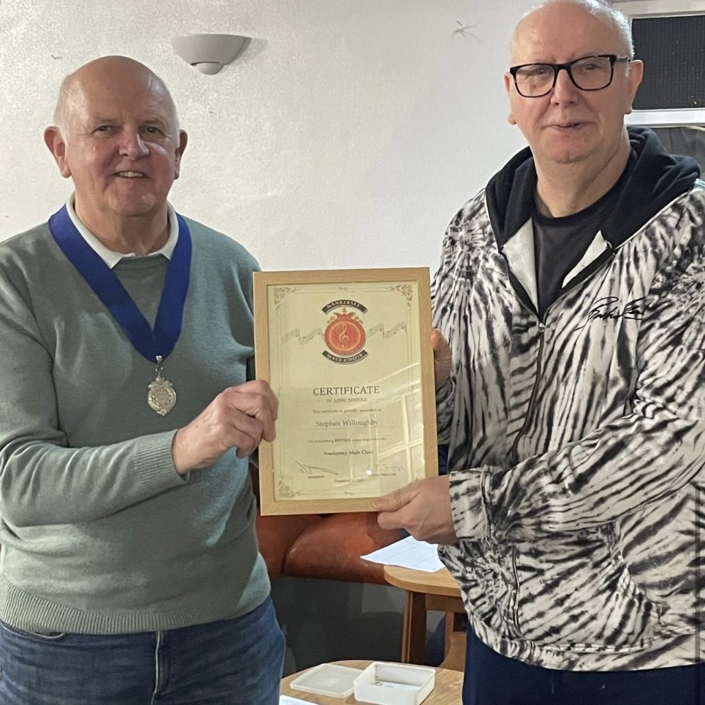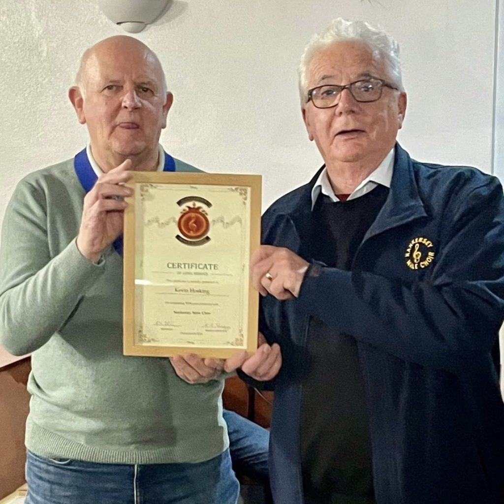 Here is Paul Yokney receiving his 15 years’ long service certificate from our new Choir President, Dave Foster
