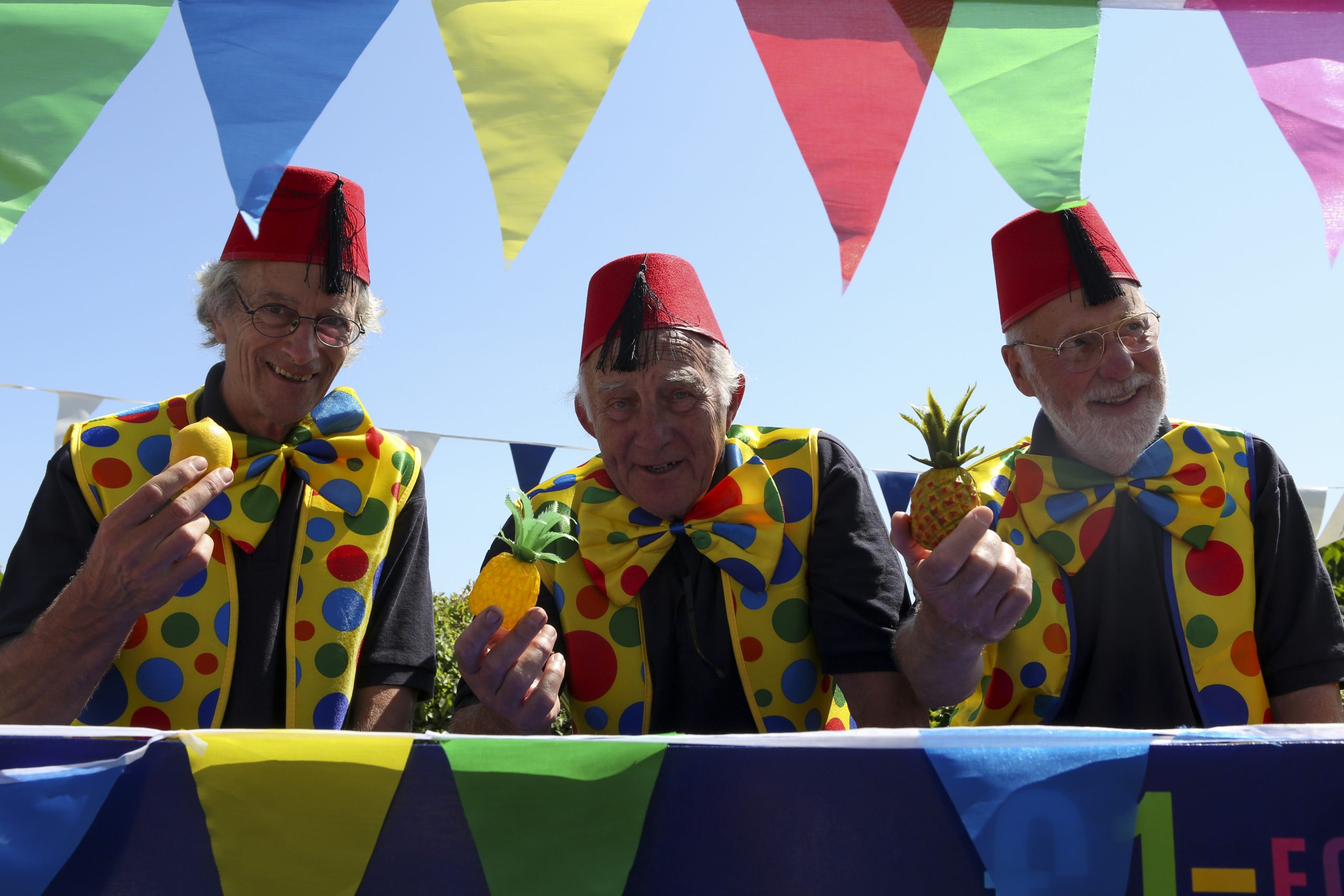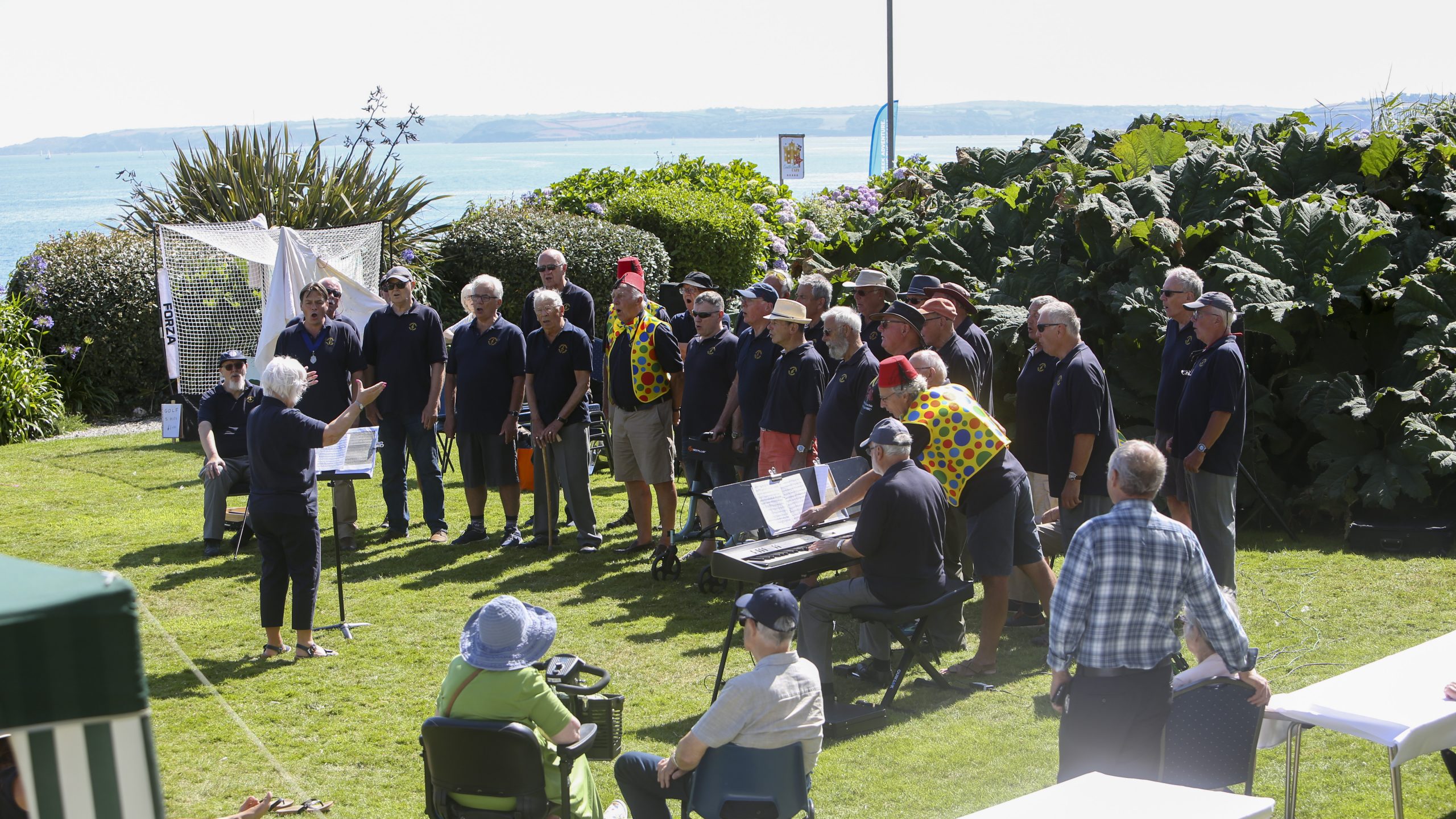 Here we are at our Annual Fete. The human ‘fruit machine’ raised funds for us and we let off a bit of steam with outdoor singing , entertaining our families, friends and visitors.